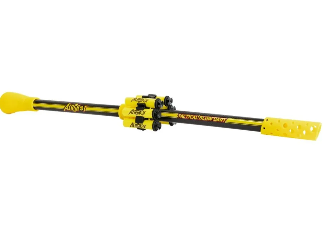 Smooth and powerful blow dart shoots soft suction darts with a 30 foot range.