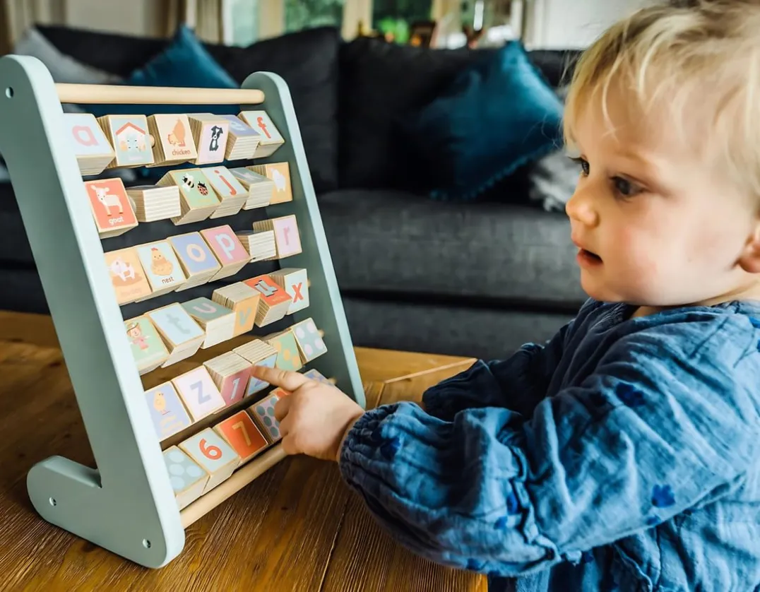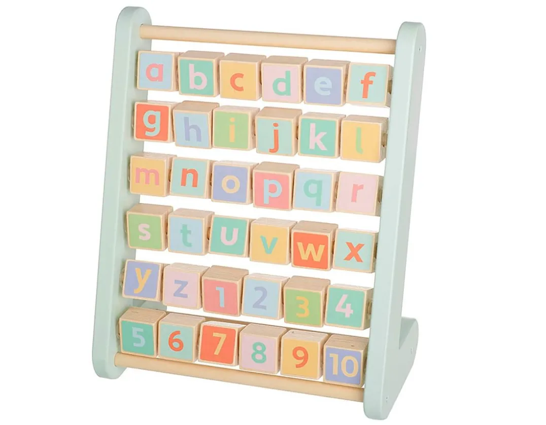 Practice letter recognition and counting with this lovely abacus. Standing 30cm tall, it has 6 rows of square beads which spin and slide along the rods. Each has a lowercase letter and a corresponding farmyard word on the other side… from C for Chicken to S for Scarecrow! Also included are the numbers 1 to 10, with colourful dots for counting. Made from FSC-certified wood, this colourful abacus is a timeless toy you can really count on!