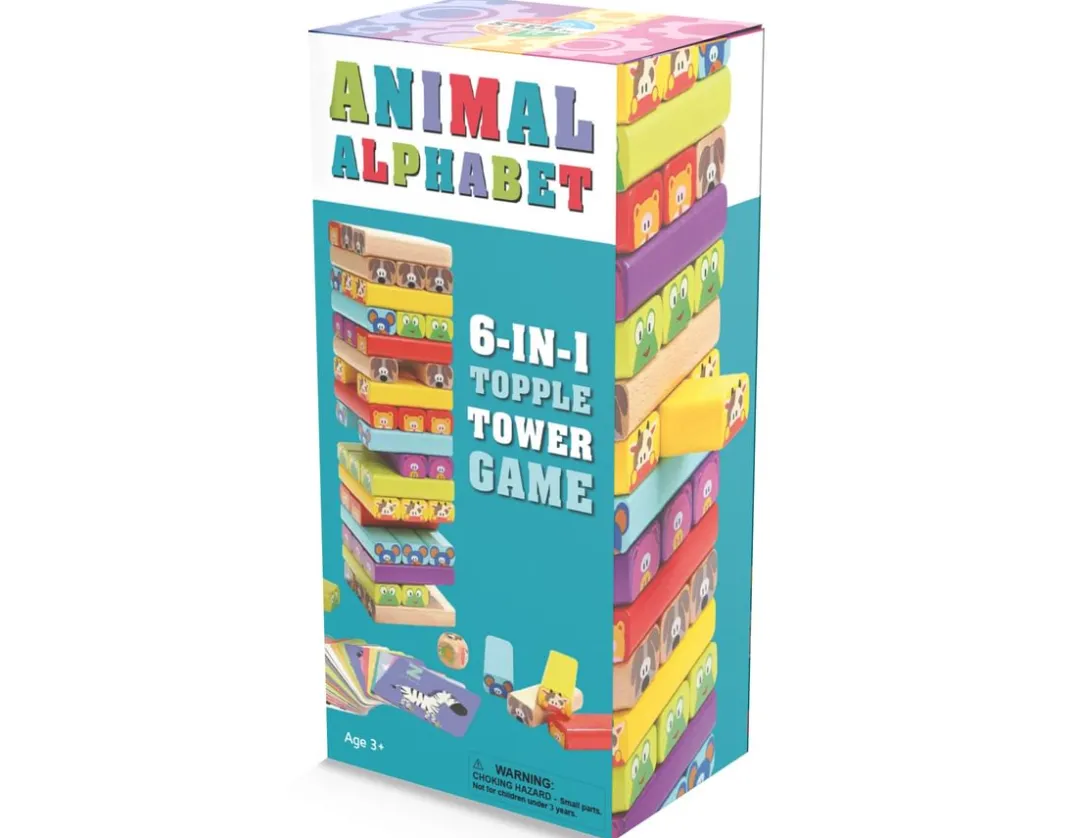 Colourful wooden building blocks with animal themes, 6 different games to play.