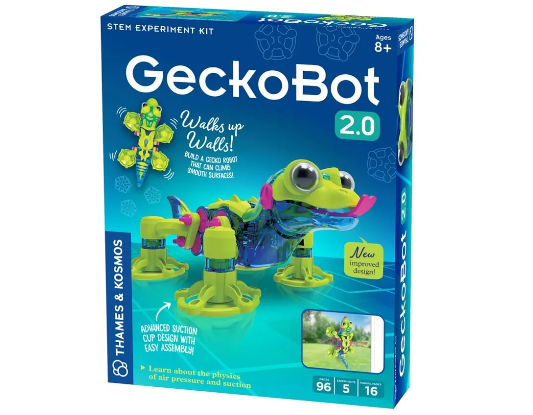Meet GeckoBot, the window walking wonder! Follow the clear illustrated guide as you assemble 96 robust plastic pieces to create the seven-inch lizard. Then watch as he defies gravity and crawls up and down your window using his awesome suction cup feet! Experiment to see which smooth wall surfaces your gecko can climb and learn all about suction and air pressure. Fascinating STEM kit for early engineers – fun from the geck-go!