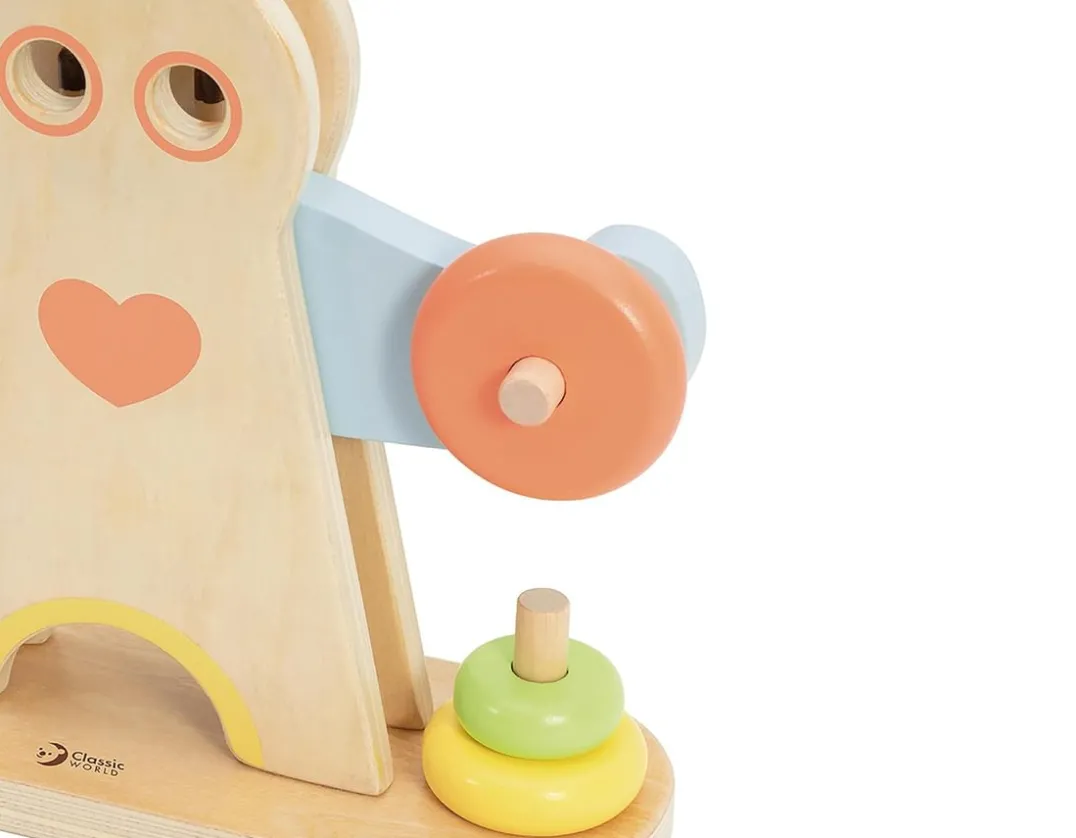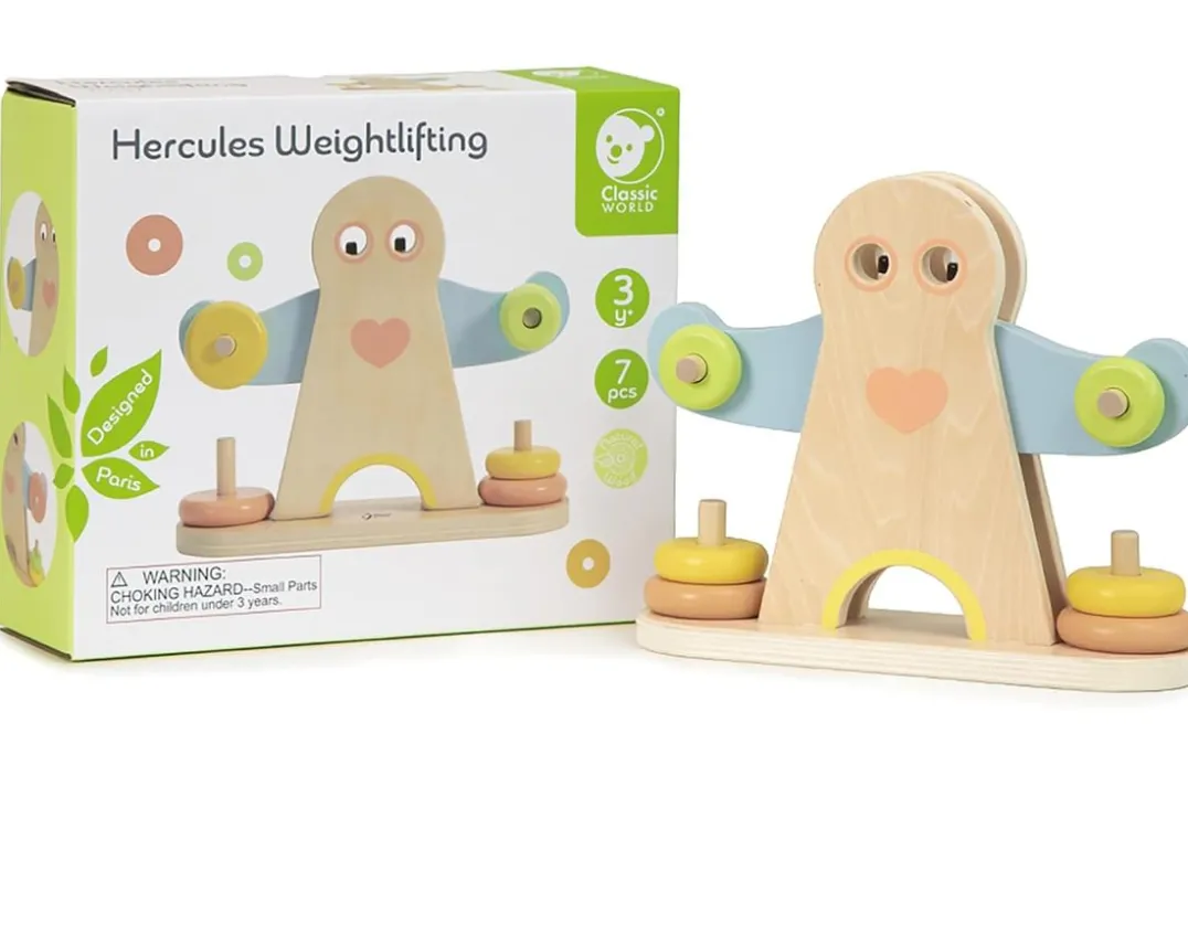 Great for little learners, this fun wooden toy looks like a man lifting weights, it’s the legendary Hercules! Slide the wooden rings onto his hands and watch as his arms teeter from left to right. Can you make them balance out? Crafted from sturdy natural wood, the set includes six ringed weights in three different sizes. The pastel colour scheme and fun challenge aspect make this a great gift for any toddler. Wibbly wobbly fun!