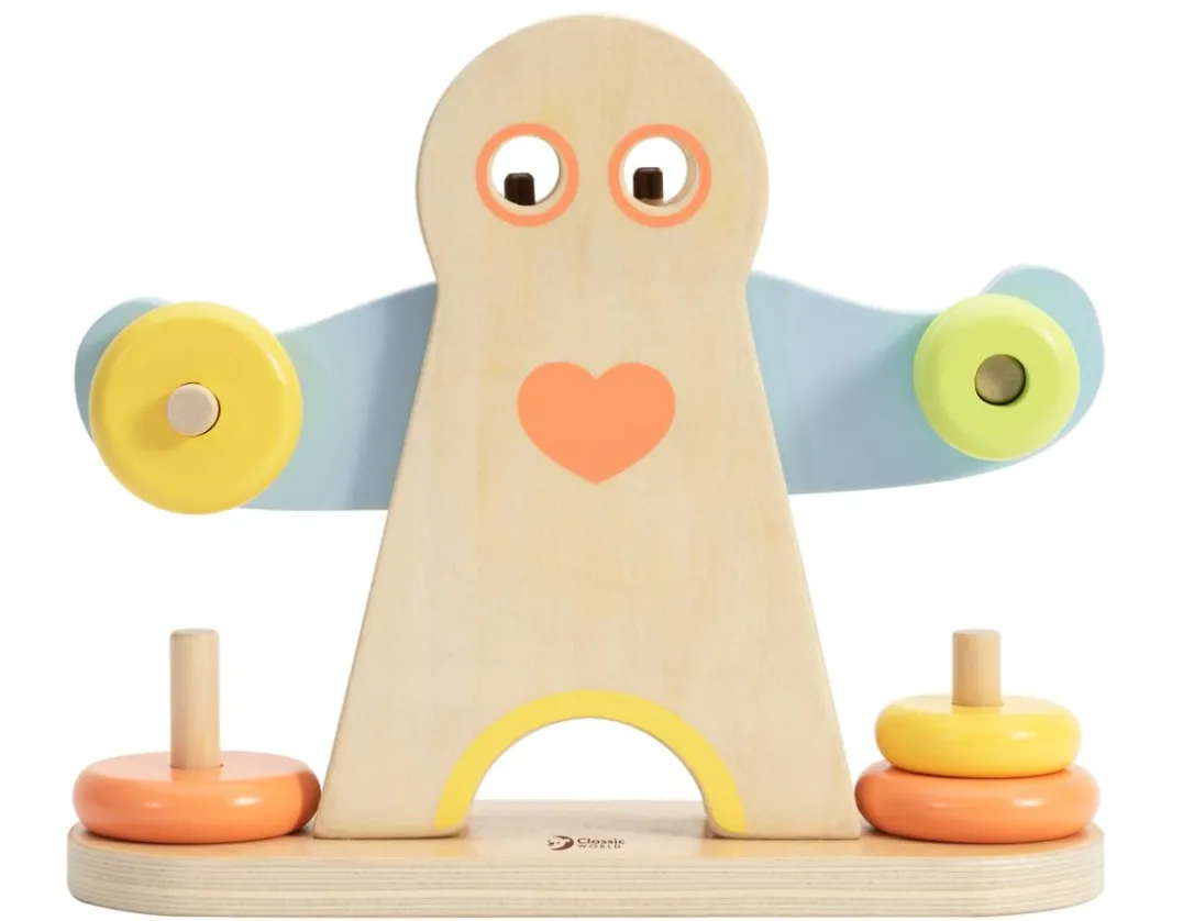 Interactive wooden scale with six colourful ringed weights.