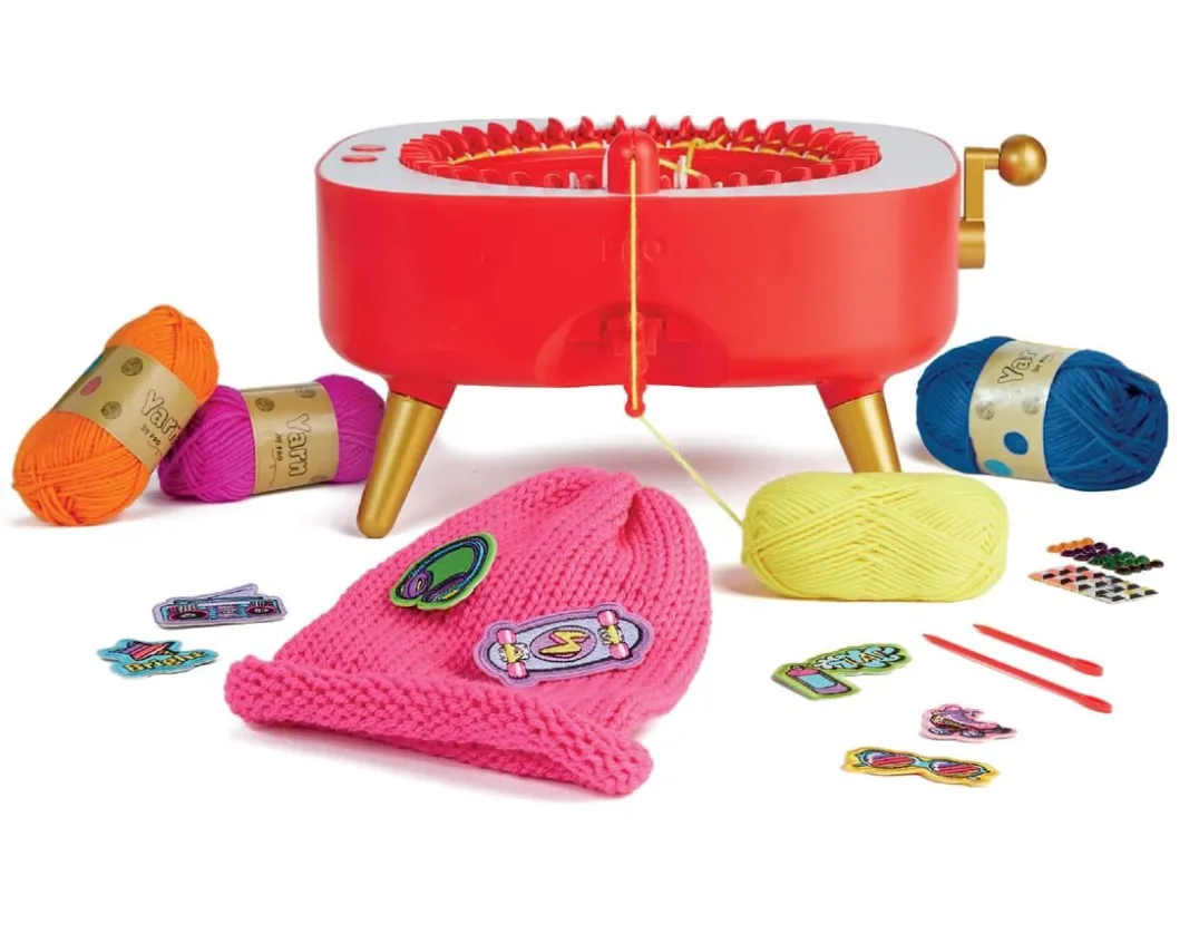 Easily knit your own accessories with this smart machine! It features 40 rotating hooks and two weave modes – create tubes for beanies and sleeves, or flat knit fabric for scarves & more. Simply hold down the button on the battery-powered unit or turn the handle and the yarn will catch each hook as they pass. Customise your knitted creations with stick-on gems and funky iron-on patches. Includes four funky colours of yarn too. Sew much fun!
