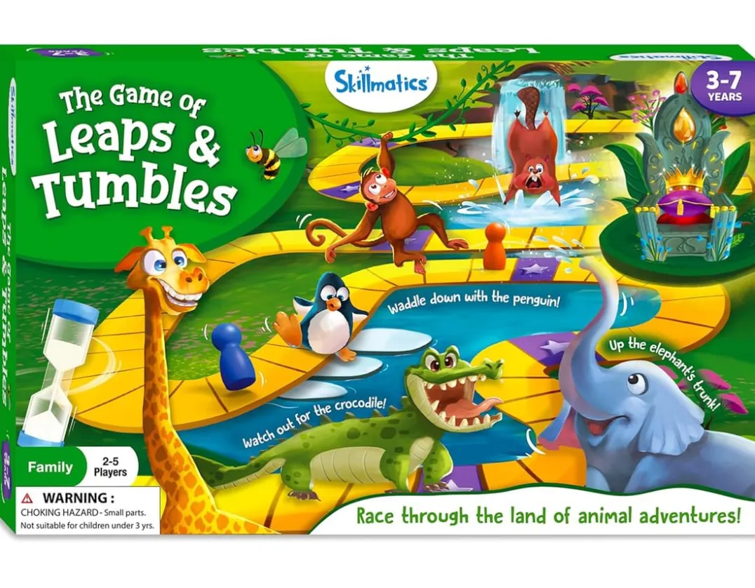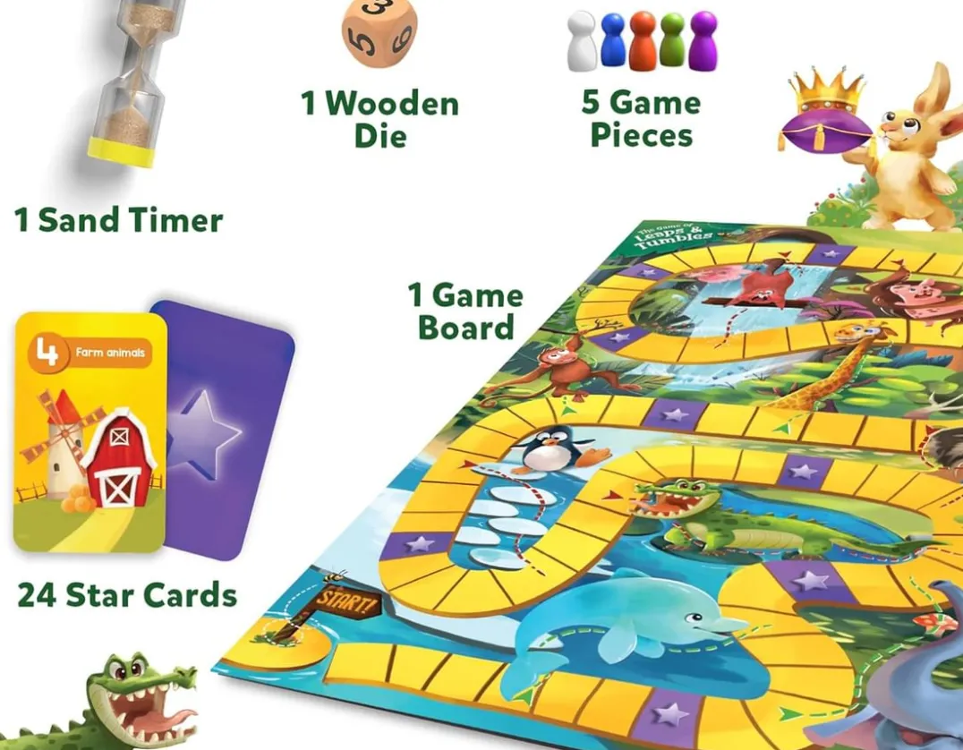 Race around the board in this fast-paced and entertaining game! Similar to snakes and ladders, roll the dice and move your play piece, looking out for adventure spots… Zoom up the elephants trunk, swing with the monkey into the trees or splash down the waterfall with a beaver! Land on a star to complete a fun challenge, like naming farm animals, insects, pets and more. Great fun for 2-5 players and perfect for animal lovers. Elephant-astic!