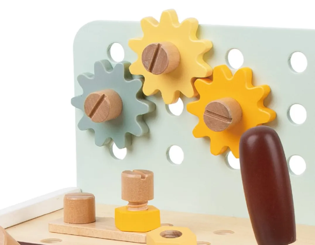Standing 30cm tall, this brilliant tabletop work bench is a must-have for any little builder. Use the bolts and nuts to affix gears and struts to the surfaces, tightening with the screwdriver and wrench included. The set even includes a functional vice and handy chalkboard too. When play is over, all the pieces store neatly inside the unit. Made from sturdy natural wood, a wonderful addition to any playroom and great for dexterity skills. Nailed it!