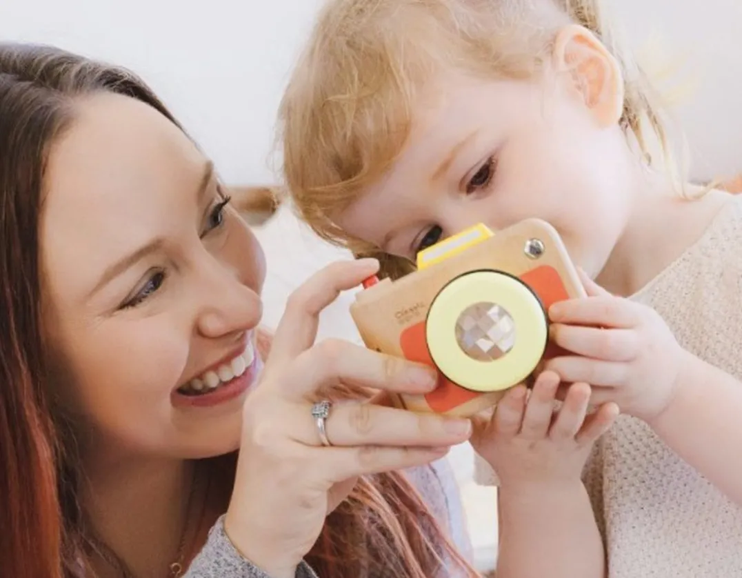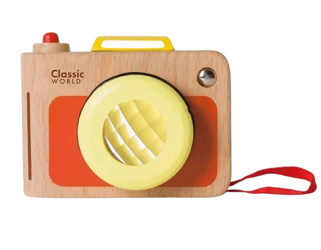 Have fun taking pictures with this adorable pretend camera! Crafted from durable FSC sustainable wood, it has a sturdy and colourful design. It features a rotating lens and an interactive shutter button – perfect to encourage imaginative play. To add to the fun the camera lens is a fascinating kaleidoscope! Lightweight and easy for little hands to hold, with a cool red strap making it great for playtime adventures on the go. Say cheese!
