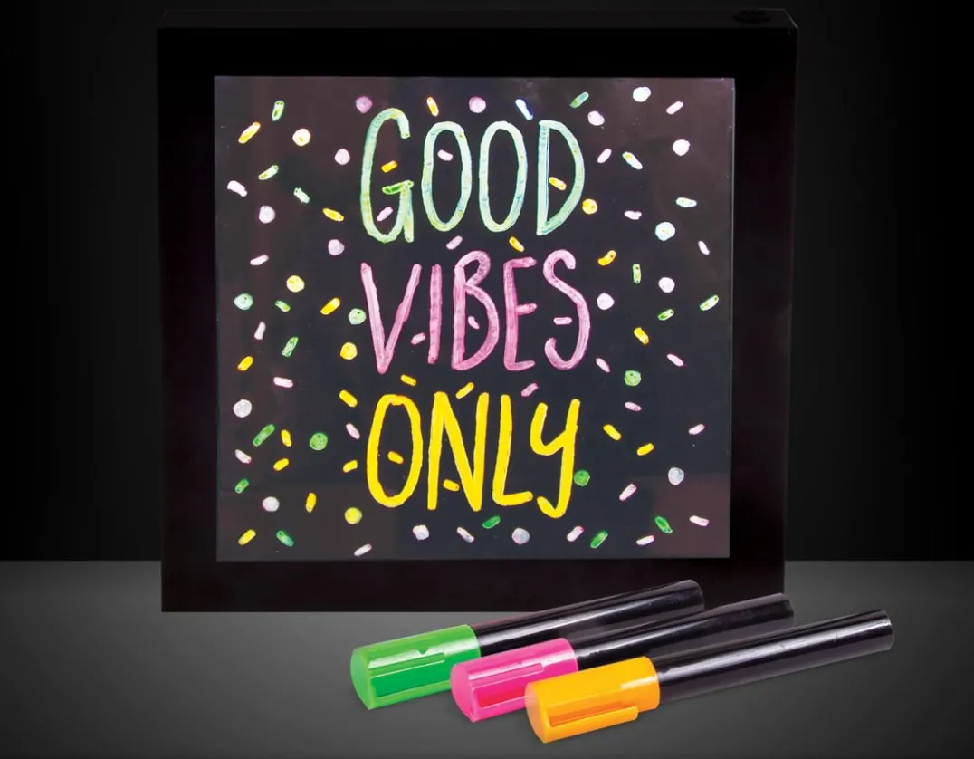 Leave notes, doodles or be wildly artistic on this cool LED light up message board. The 23cm square frame is made from plastic and features a central glass panel for writing your messages. Use the bright, vibrant neon pens to create your messages, choose from pink, green and orange. The frame can be hung on the wall or stands free on any flat surface. Turn the frame on and watch as your message illuminates with a bright neon effect glow. Simply wipe clean using a dry cloth and start all over again. Be inspired!