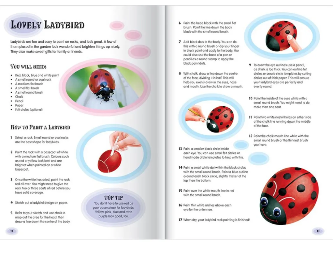 This booming worldwide craze has children everywhere getting outdoors to play hide and seek with hand painted rocks. Packed with everything you need to create your own original painted rocks, this kit includes six smooth river stones, six quality acrylic paints and two fine paintbrushes. The 48 page book is filled with tips, tricks and step by step craft projects for several quirky rock art creations, from a ladybird to a spider. Also includes suggested games to play with your rocks – join the craze for hours of outdoor fun!