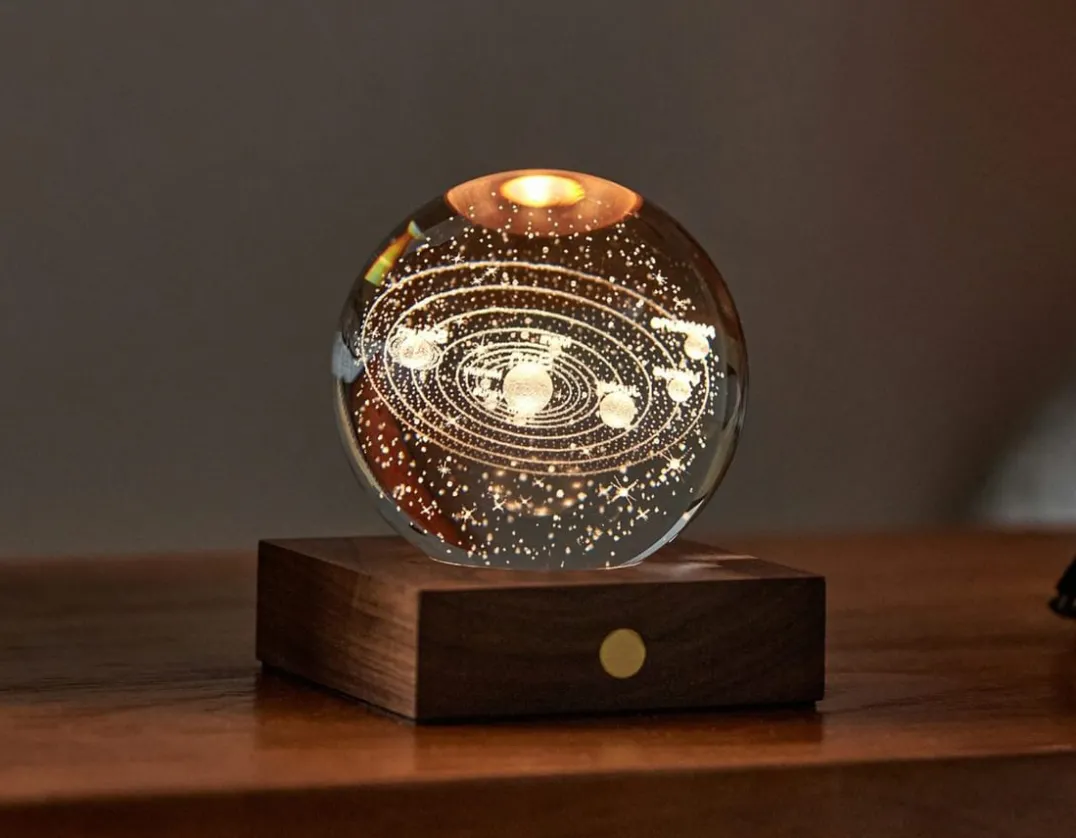 Let the light shine with this luxury crystal ball light featuring a 3D laser-engraved space design. Simply touch the copper button to cycle through 3 brightness levels. The built-in light shines through the 8cm polished glass orb and the labelled engraving glows just like magic. The walnut base is fitted with a rechargeable battery that can provide up to 16 hours of light on a single charge. A perfect way to add some extra magic to your room. Stellar!