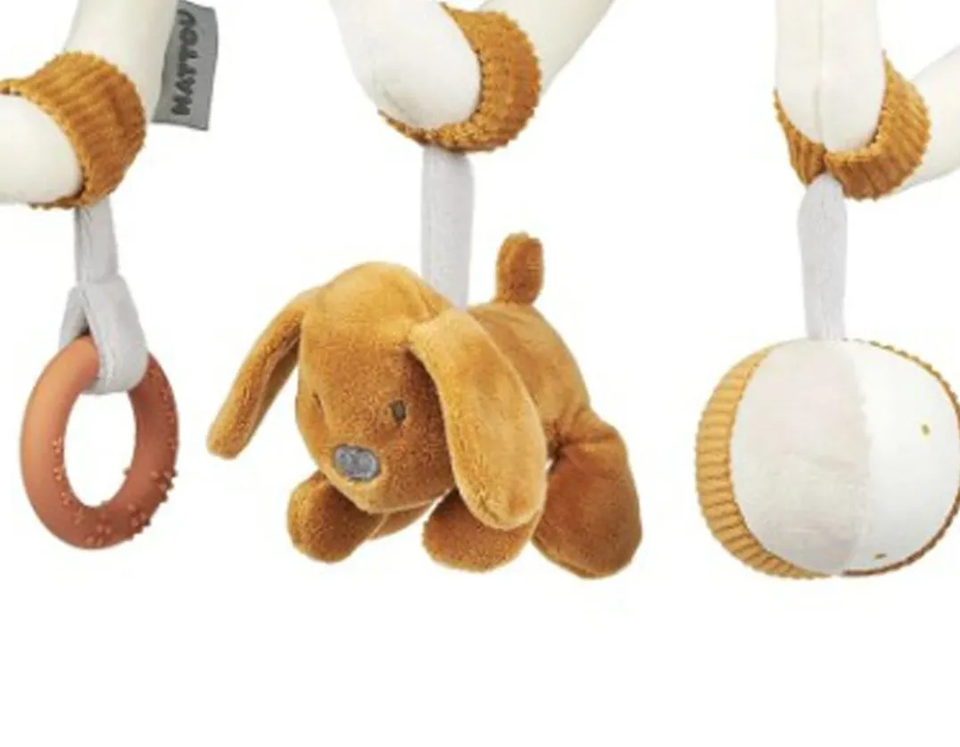 This wonderful interactive toy has lots of elements to interest and engage little tots! Simply use the innovative spiral design to quickly and easily attach it to a crib, car seat or pram. Little ones will love exploring the rattling ball and squeaky plush puppy, before soothing their gums on the silicone teething ring. Designed in Belgium by luxury brand Nattou, this cute toy has a modern neutral colour scheme with caramel accents. So sweet!