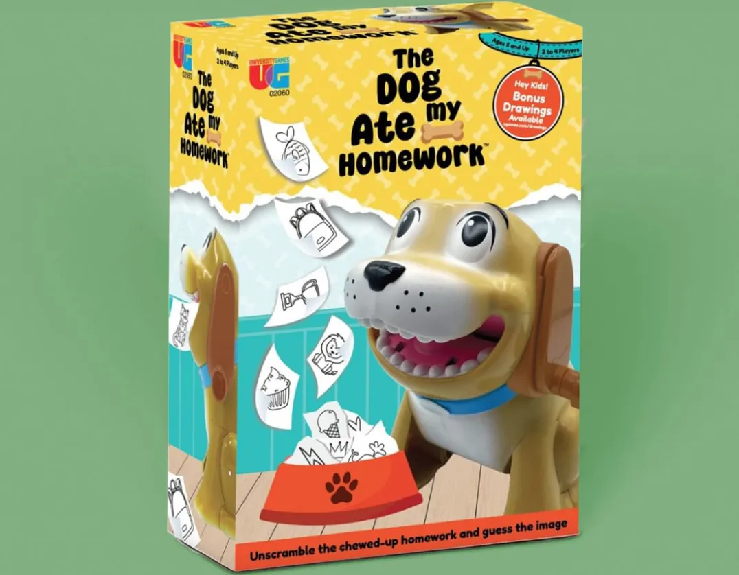 Perfect for 2-4 players, this clever game features a naughty pooch that loves to eat homework. Simply feed him a drawing, twist his ear and watch as it comes out of his rear end in strips. Start the timer and race to unscramble the image before the time runs out! From a cake to a rocket, a toothbrush to a goose, choose from the included 100 homework sheets to feed to your cheeky dog. Fast-paced fun for all ages. Paw-sitively perfect!