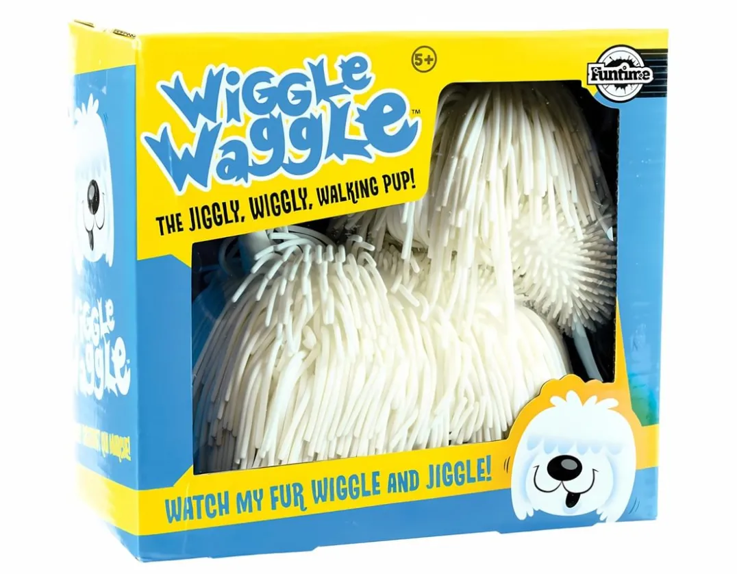 Meet Wiggle Waggle, your very own super cute puppy! Measuring 17cm from nose to tail, he looks like a hairy sheepdog, with long fur made from bouncy and tactile silicone. Simply push the button on his head and watch him walk and wiggle to a happy tune for twenty seconds. He even barks whilst wagging his little tail back and forth – and his rubbery fur makes him look really funny! Guaranteed to make you smile. Woof woof, wiggle waggle!