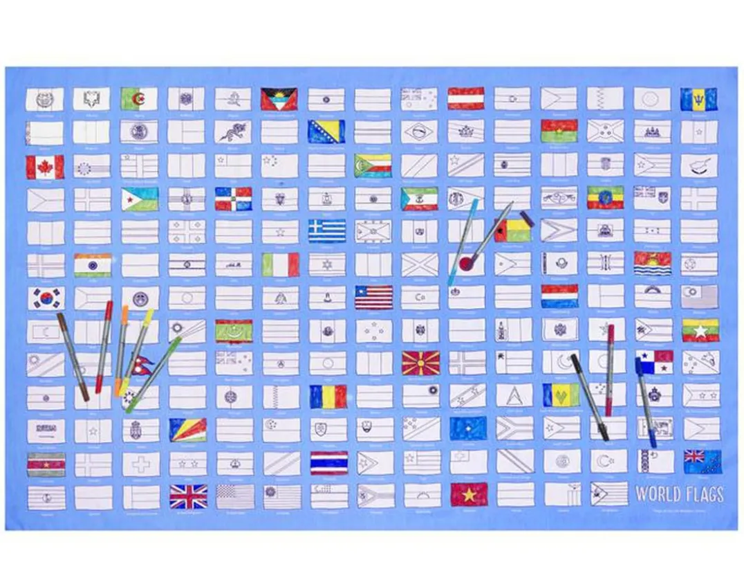This fun pack comes with a 130cm x 85cm soft cotton tablecloth and 10 bright wash out pens so you can doodle, wash and re-doodle again and again. Explore and decorate the 193 amazing flags of the United Nations member states, from Albania to Zimbabwe, including our very own Union Jack! When complete, you can even use the attached loops to make the tablecloth into a smart wall hanging. Geography homework has never been so appealing!