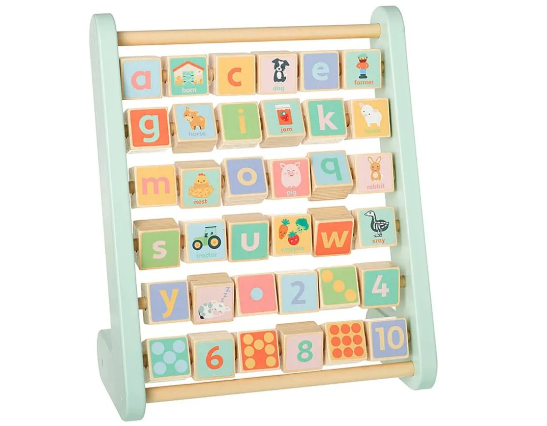 Practice letter recognition and counting with this lovely abacus. Standing 30cm tall, it has 6 rows of square beads which spin and slide along the rods. Each has a lowercase letter and a corresponding farmyard word on the other side… from C for Chicken to S for Scarecrow! Also included are the numbers 1 to 10, with colourful dots for counting. Made from FSC-certified wood, this colourful abacus is a timeless toy you can really count on!