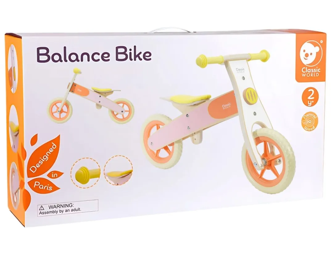 Wooden balance bike with adjustable seat height, perfect for toddlers.
