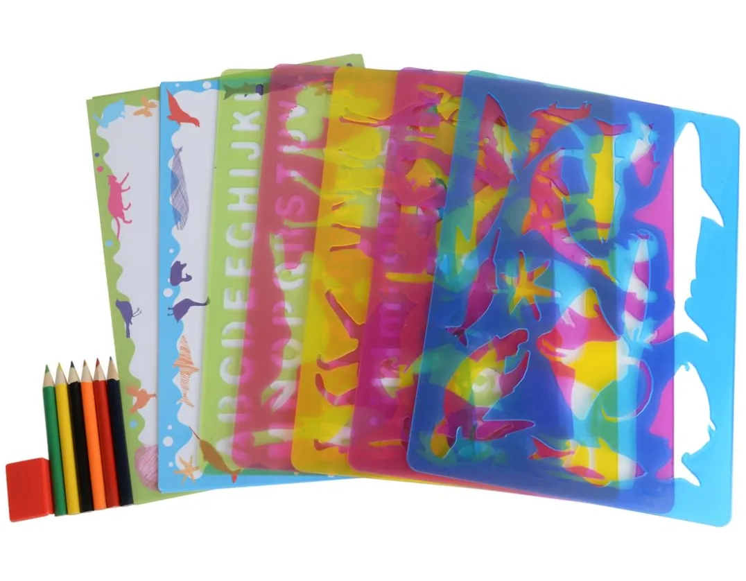 Fun box of assorted animal themed stencils with coloured pencils and paper.