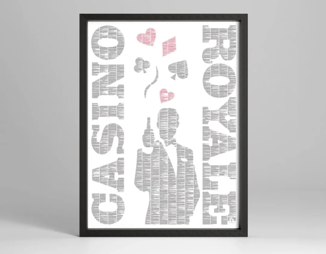 This is the classic novel that introduced secret agent James Bond to the world. This clever design uses the full complete text of the famous novel to form this impressive illustration of 007’s iconic pose on a poster. Measuring 100cm by 70cm, with high quality non-fade print for pin-sharp text on satin finish paper, the small type is fully readable up close. Makes an unusual room decoration and a real talking point – happy reading Mr Bond!
