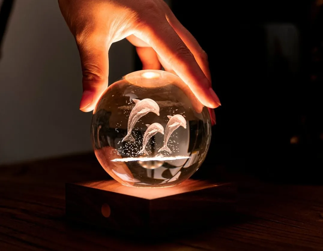 Let the light shine with this luxury crystal ball light featuring a 3D laser-engraved dolphin design. Simply touch the copper button to cycle through 3 brightness levels. The built-in light shines through the 8cm polished glass orb and the engraving glows just like magic. The walnut base is fitted with a rechargeable battery that can provide up to 16 hours of light on a single charge. A perfect way to add extra magic to your room. Sea-riously cool!