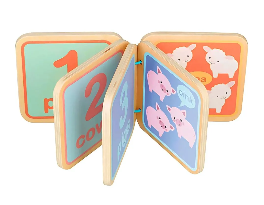 Wooden 9cm book with farmyard animals, to help little ones count from 1 to 4.