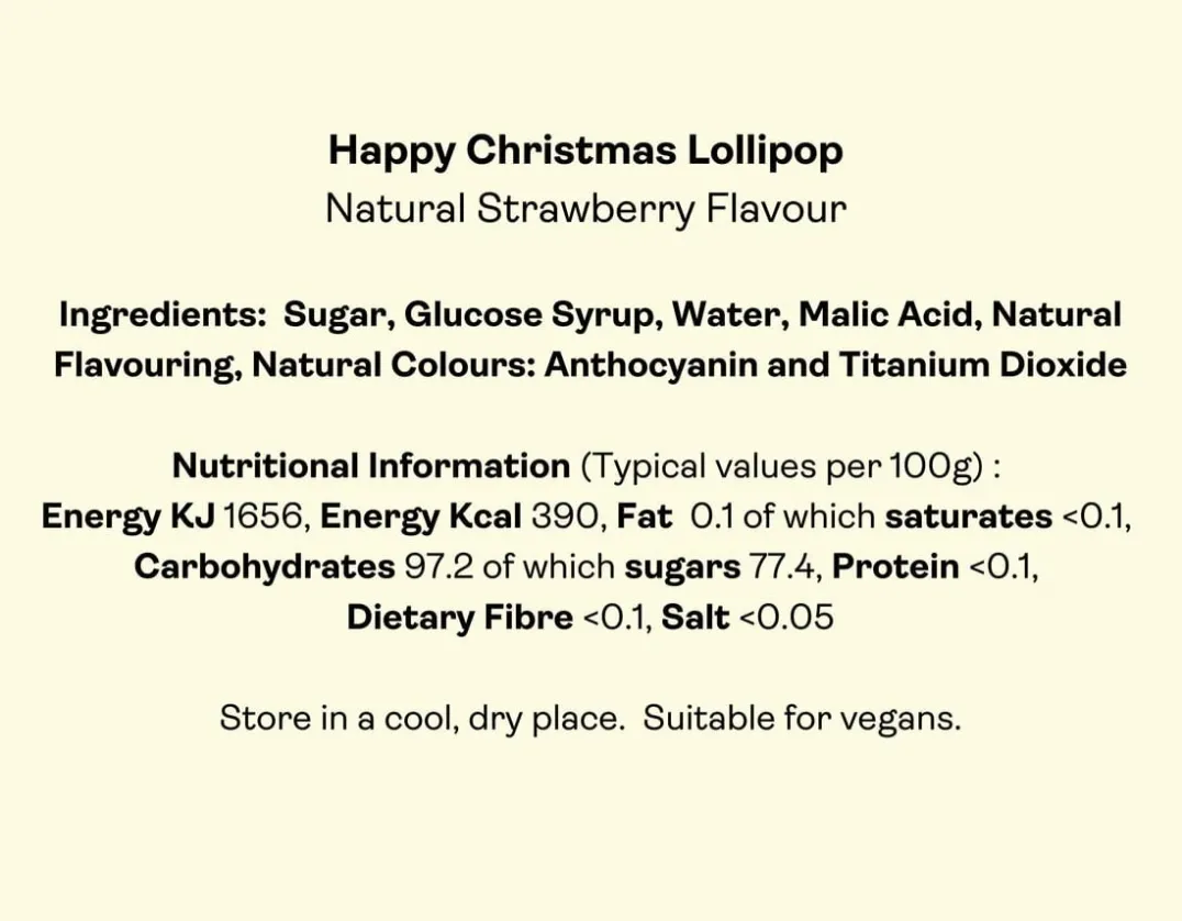 Celebrate in style with this fun festive lollipop. Measuring 9cm, it has a cool ‘Happy Christmas’ motif, complete with snowflakes. The same texture as boiled sweets, it has a totally delicious natural strawberry flavour – yum! Made in the UK and suitable for vegans too. Happy Christmas!