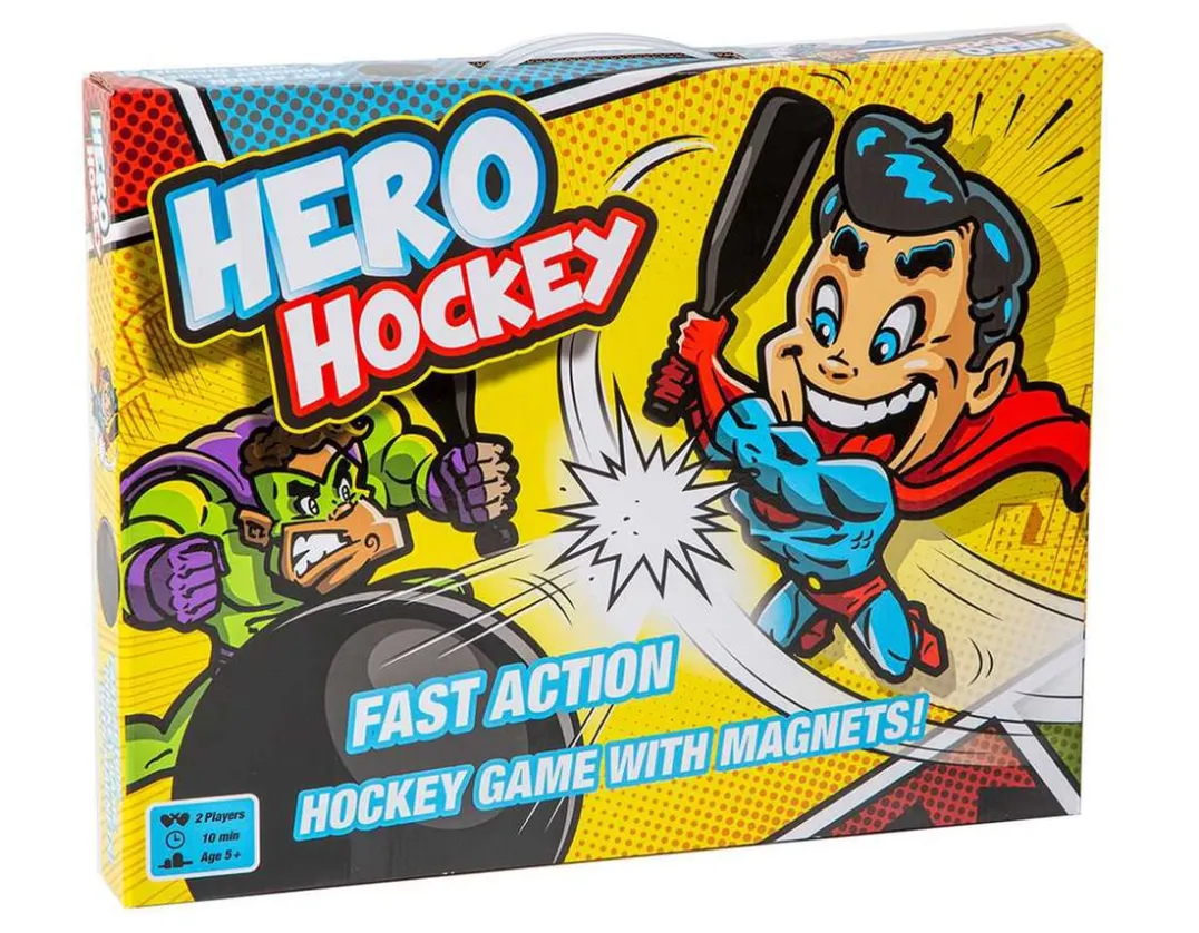 Battle it out in this brilliant head-to-head hockey game for two players. Control your colourful superhero striker with a steering magnet underneath the playing field. Spin and swipe to make him dribble the ball, swing his stick and score a point! The first to smash six balls into their opponents goal is the Hero Hockey champion. Fast-paced and competitive fun, this cool game requires no batteries – just fast fingers and super skills, with a will to win!