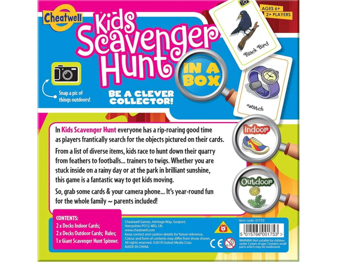 Get ready as the spinner decides how many cards each player has, then the race is on to to track down the pictured objects. Play indoors to collect household items from a trainer or ball to a cuddly toy or piece of fruit. For fresh air fun, use the outdoors cards to search for anything from a red flower to a twig or a garden ornament. Some cards show the camera icon to take a photo as proof – better than bringing back an actual snail! Entertaining and very energetic – rip-roaring fun!