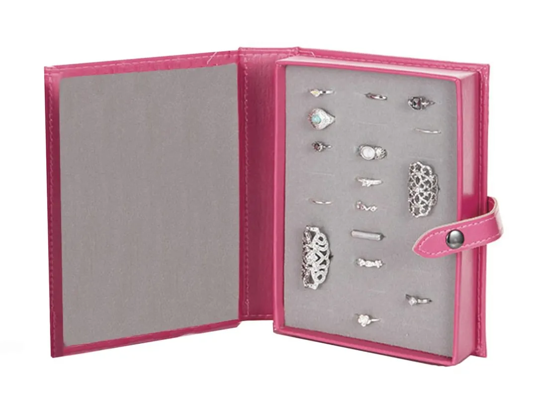Designed like a leather-bound book, this nifty storage solution lets you organize your jewellery collection. Open the cover to reveal a deep padded compartment with 27 slots in rows of three. Simply push your rings in one by one to keep them in place! With a bright pink wipe-clean cover and sturdy popper closure too. A practical and quirky way to store your earrings, on the go or at home. Ring, ring – hello!