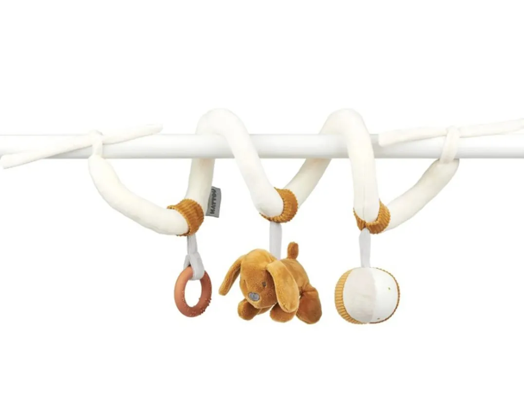This wonderful interactive toy has lots of elements to interest and engage little tots! Simply use the innovative spiral design to quickly and easily attach it to a crib, car seat or pram. Little ones will love exploring the rattling ball and squeaky plush puppy, before soothing their gums on the silicone teething ring. Designed in Belgium by luxury brand Nattou, this cute toy has a modern neutral colour scheme with caramel accents. So sweet!