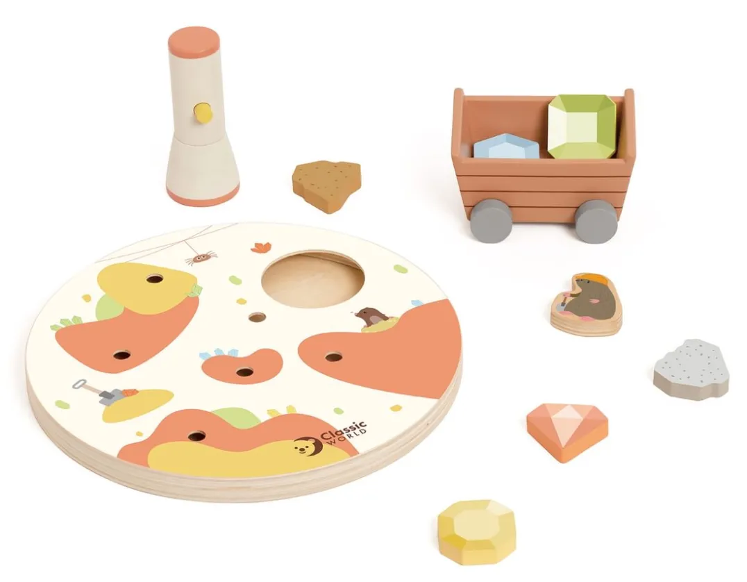 Enjoy a spot of treasure hunting with this wonderful wooden toy! Insert the seven gems into the 20cm round game board and shake to shuffle them about. Little ones can then use the magnetic ‘torch’ to locate each one and maneuver it to the cave entrance! Pop your spoils into the wheeled mining cart to finish. Engaging mess-free fun for little learners, this stylish toy is great for developing co-ordination and language skills. What a gem!