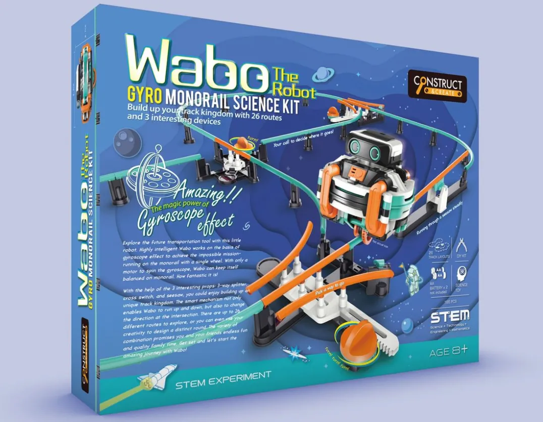 Discover the amazing power of gyroscope effect with this cool monorail robot. Use the illustrated instruction manual to build this fascinating 186 piece kit, with 26 track layouts on the looping monorail track. Wabo will navigate the circuit, balancing on just a single wheel like a tightrope walker! Use the 3-way splitter and cross switch to send Wabo in different directions and even across a seesaw. Brilliant fun project – seems to defy gravity!