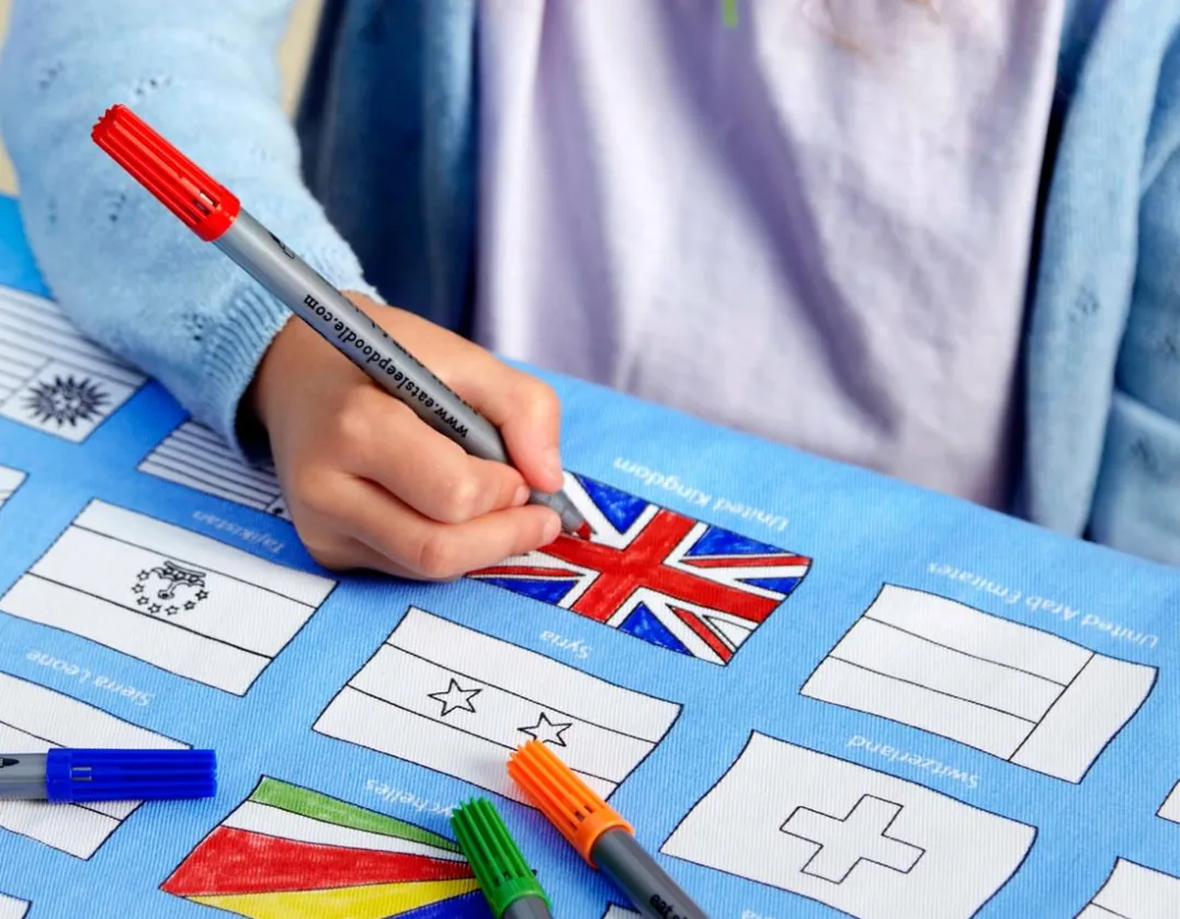 This fun pack comes with a 130cm x 85cm soft cotton tablecloth and 10 bright wash out pens so you can doodle, wash and re-doodle again and again. Explore and decorate the 193 amazing flags of the United Nations member states, from Albania to Zimbabwe, including our very own Union Jack! When complete, you can even use the attached loops to make the tablecloth into a smart wall hanging. Geography homework has never been so appealing!